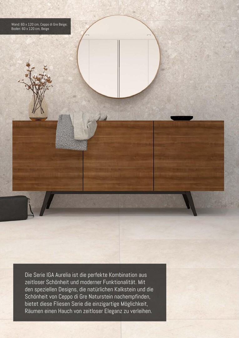 Die Serie IGA Aurelia ist die perfekte Kombination aus zeitloser Schönheit und moderner Funktionalität. Mit den speziellen Designs, die natürlichen Kalkstein und die Schönheit von Ceppo di Gre Naturstein nachempfinden, bietet diese Fliesen Serie die einzigartige Möglichkeit, Räumen einen Hauch von zeitloser Eleganz zu verleihen.