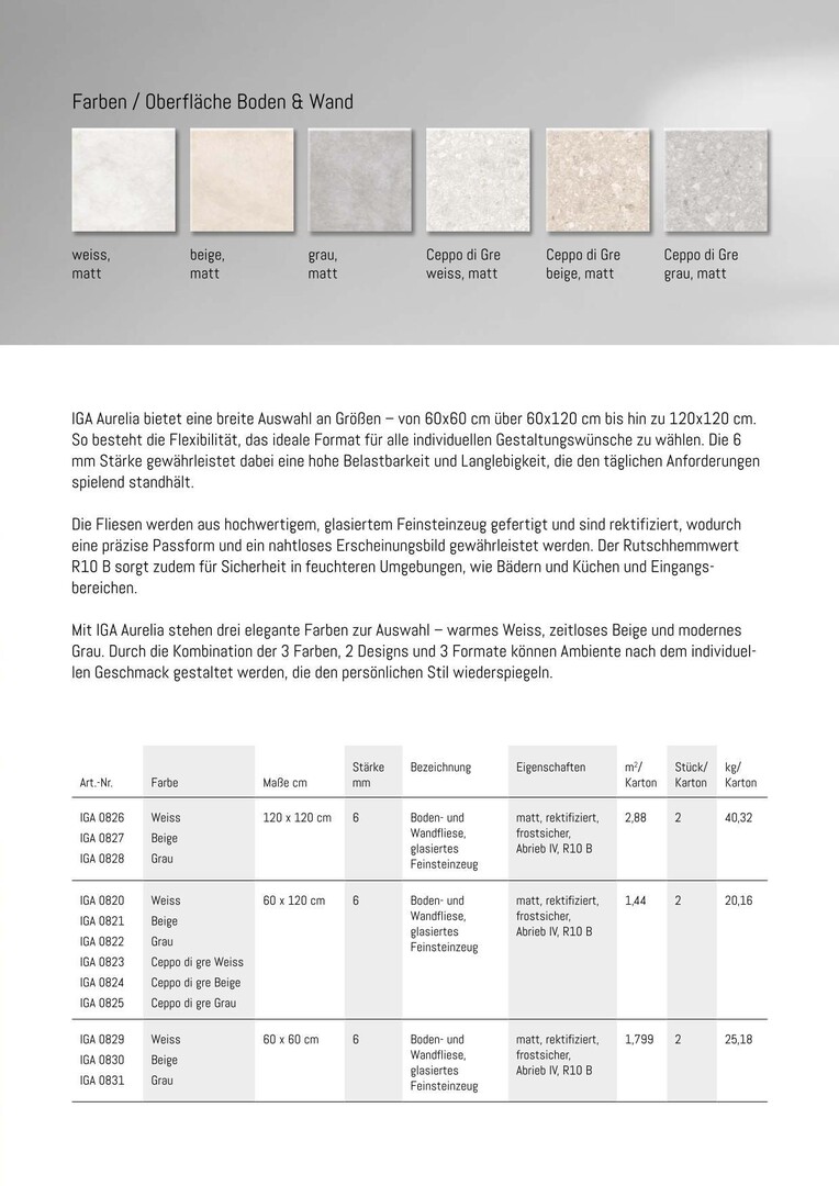 Mit IGA Aurelia stehen drei elegante Farben zur Auswahl – warmes Weiss, zeitloses Beige und modernes Grau. Durch die Kombination der 3 Farben, 2 Designs und 3 Formate können Ambiente nach dem individuellen Geschmack gestaltet werden, die den persönlichen Stil wiederspiegeln.