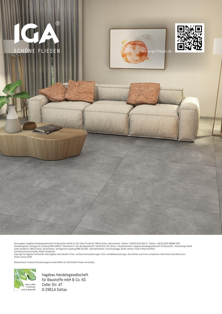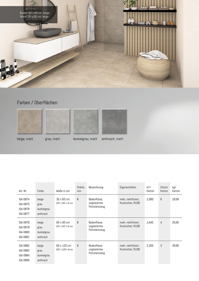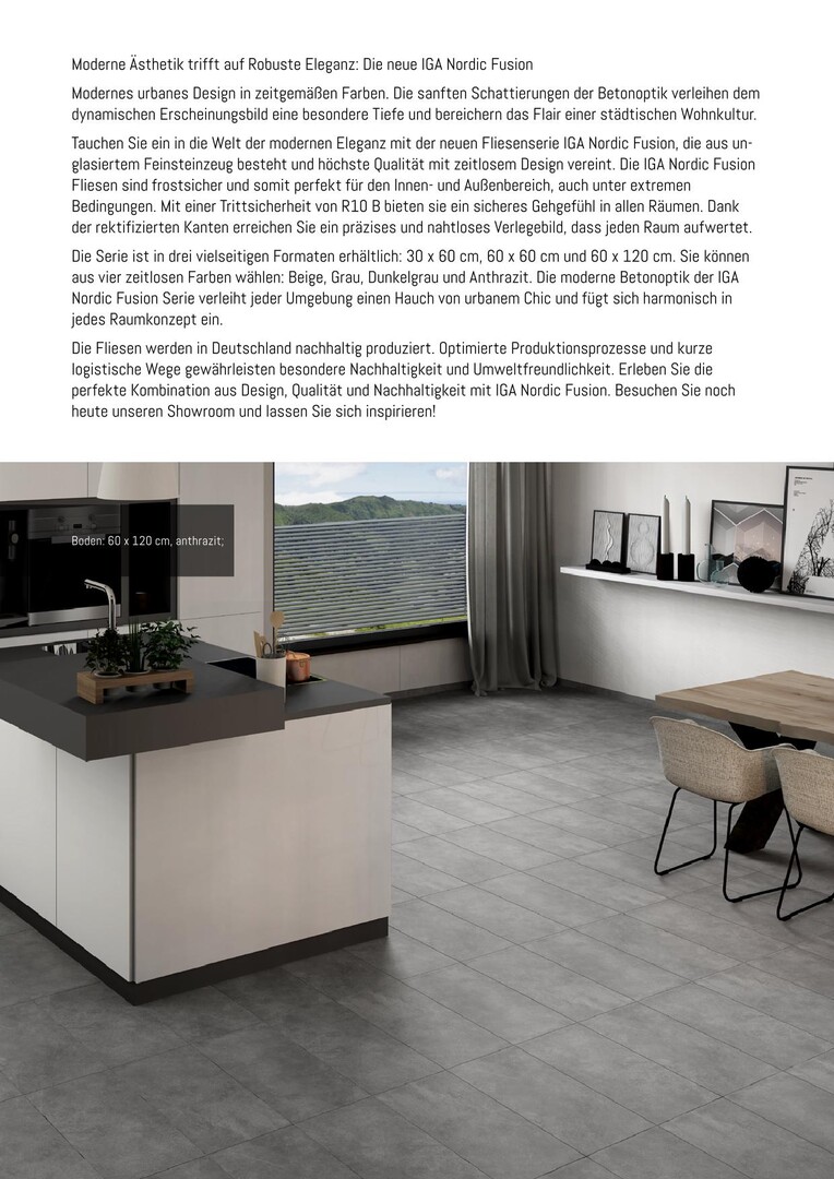 Die Serie ist in drei vielseitigen Formaten erhältlich: 30 x 60 cm, 60 x 60 cm und 60 x 120 cm. Sie können aus vier zeitlosen Farben wählen: Beige, Grau, Dunkelgrau und Anthrazit. Die moderne Betonoptik der IGA Nordic Fusion Serie verleiht jeder Umgebung einen Hauch von urbanem Chic und fügt sich harmonisch in jedes Raumkonzept ein.
