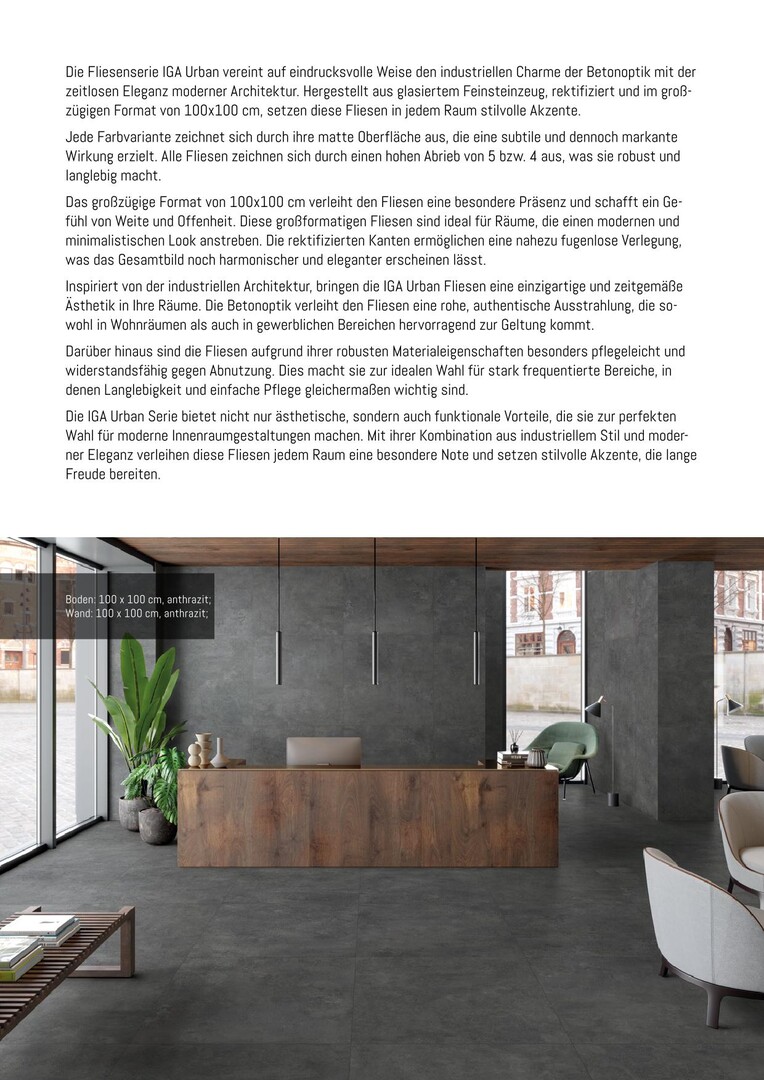 Die IGA Urban Serie bietet nicht nur ästhetische, sondern auch funktionale Vorteile, die sie zur perfekten Wahl für moderne Innenraumgestaltungen machen. Mit ihrer Kombination aus industriellem Stil und moderner Eleganz verleihen diese Fliesen jedem Raum eine besondere Note und setzen stilvolle Akzente, die lange Freude bereiten.